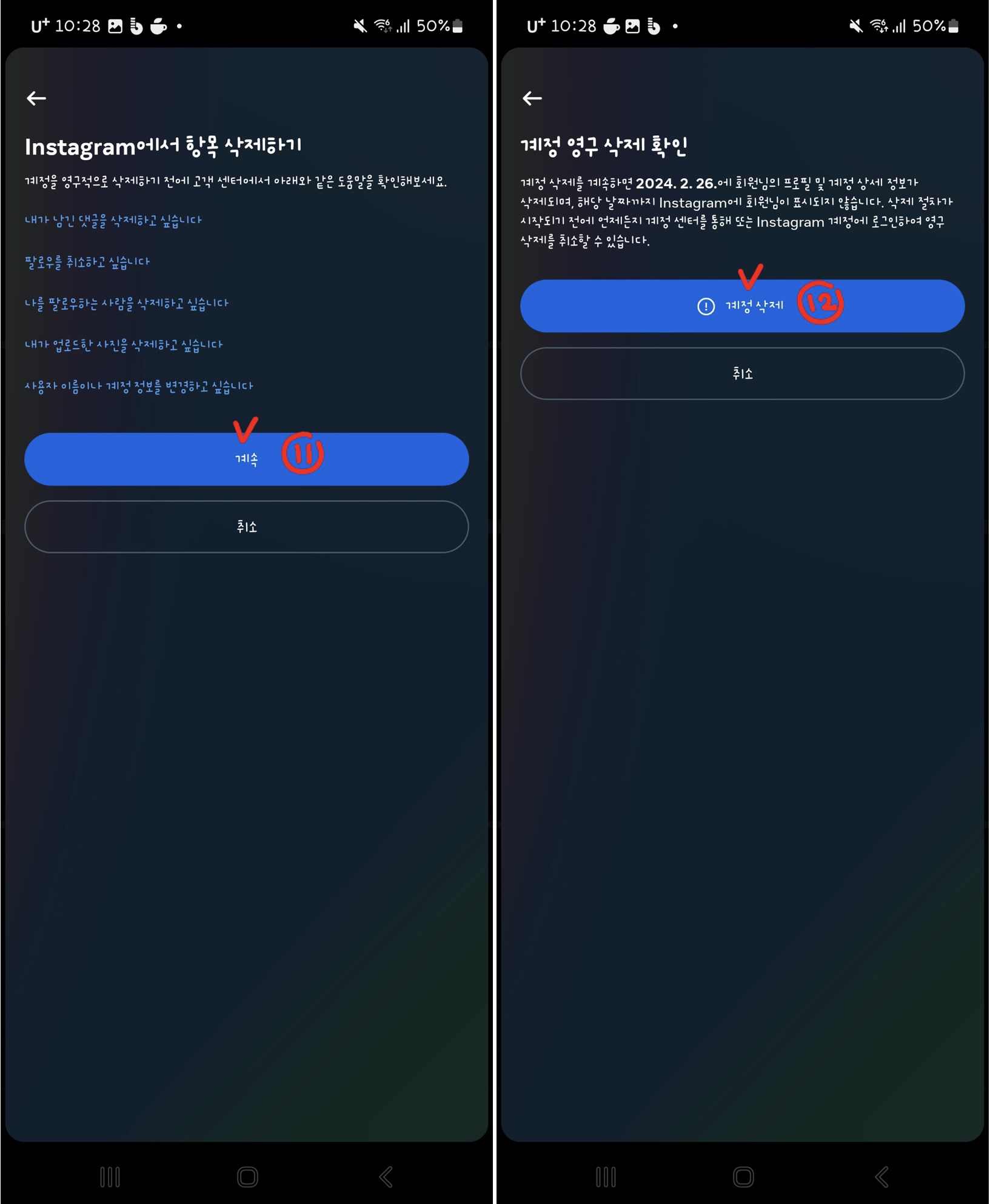 다음 화면으로 넘어가면 한번 더 개인정보 보호에 관한 내용이 나오는데 하단에 계속 버튼을 눌러 진행해주세요. 삭제하는 이유에서 선택하는 내용에 따라 다음 화면에 문구가 달라지지만 크게 문제될 것은 없습니다.