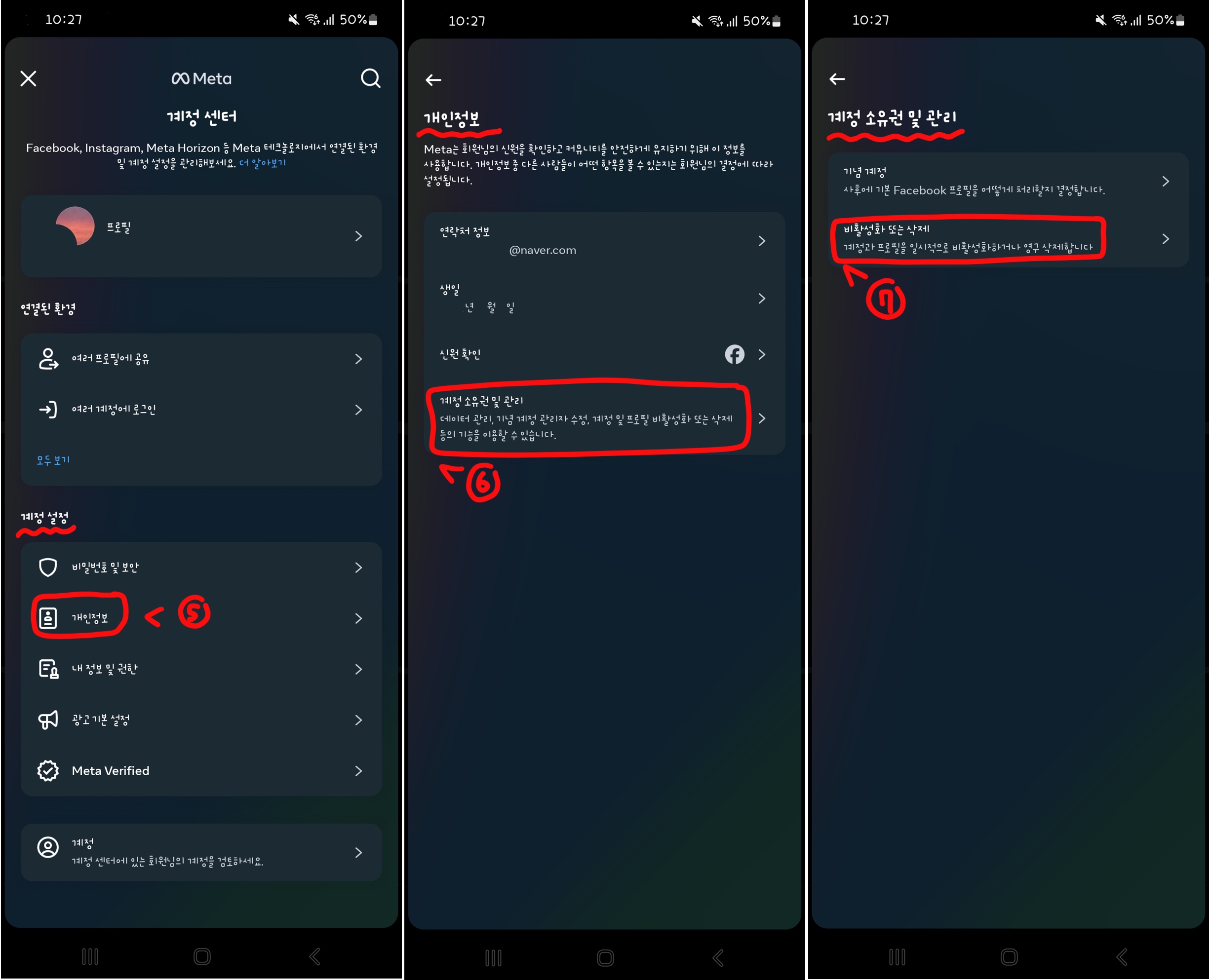 계정센터에서는 비밀번호와 보안, 개인정보 등을 설정할 수 있습니다. 중간즈음에 위치한 개인정보 탭을 선택해주세요. 개인정보 화면에서 연락처 정보, 생일, 계정 소유권 및 관리 3가지 탭이 나타나는데 그 중 맨 아래에 위치한 계정 소유권 및 관리 탭을 선택하여 비활성화 또는 삭제를 눌러주세요.