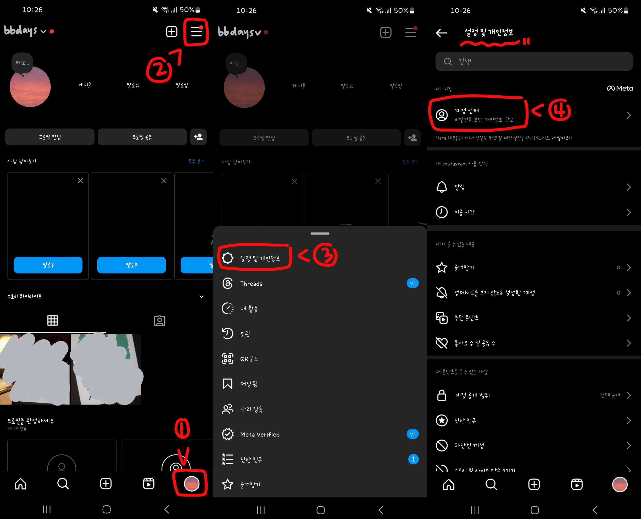 인스타그램 어플리케이션을 실행하여 제일 먼저 오른쪽 하단에 있는 프로필 아이콘을 눌러 내 피드가 보이는 화면으로 이동해주세요. 그리고 화면의 우측 상단에 있는 가로 줄 세개 아이콘(더보기 메뉴)을 누르면 창이 뜨는데 맨 위에 있는 설정 및 개인정보 메뉴를 선택하여 다음으로 이동해주세요. 설정 및 개인정보 탭에 들어오면 계정 센터를 선택하여 다음으로 넘어가주세요.