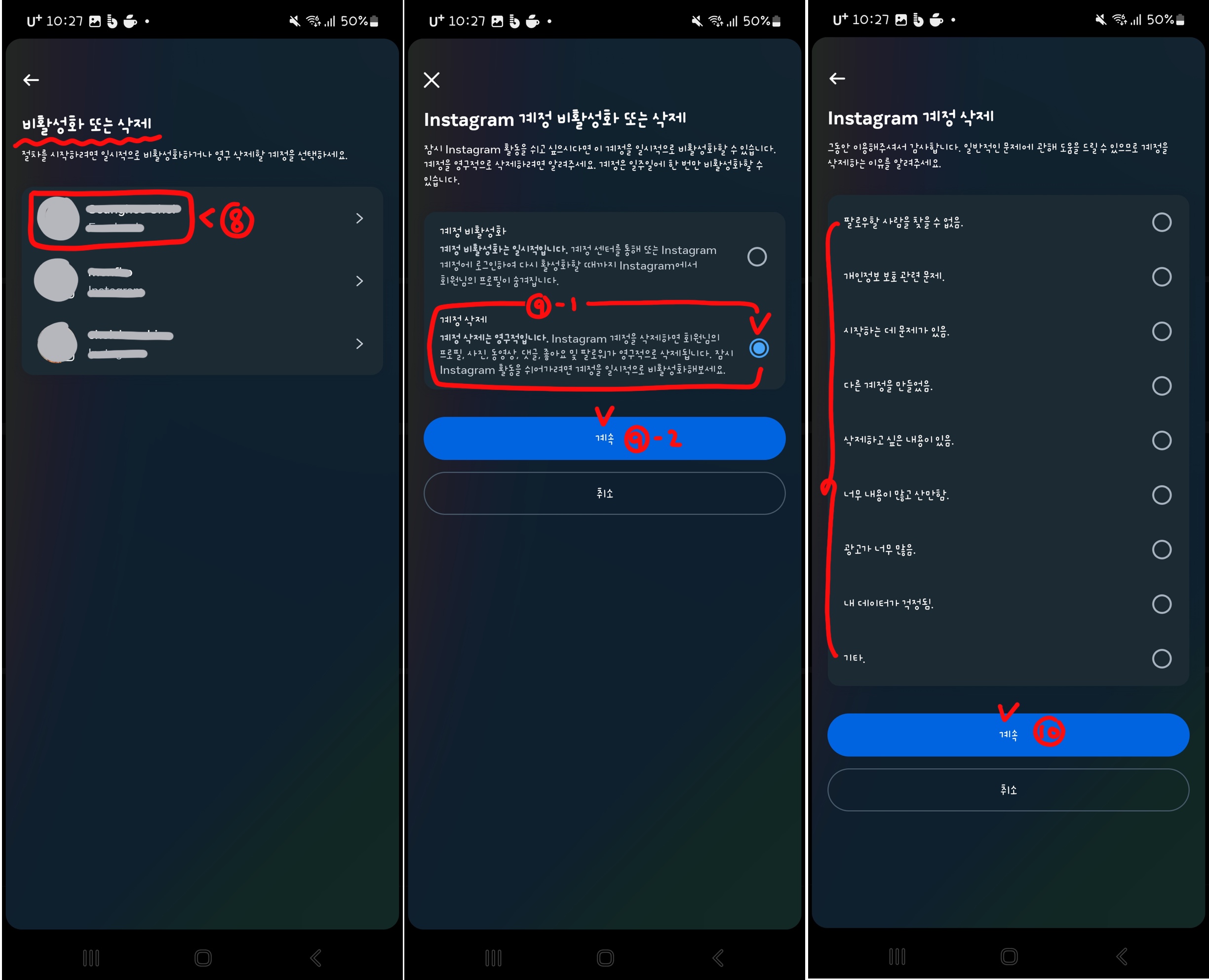 삭제할 계정을 선택하셨다면 다음 화면에서 계정삭제를 선택한 후 아래에 위치한 계속 버튼을 눌러주세요.