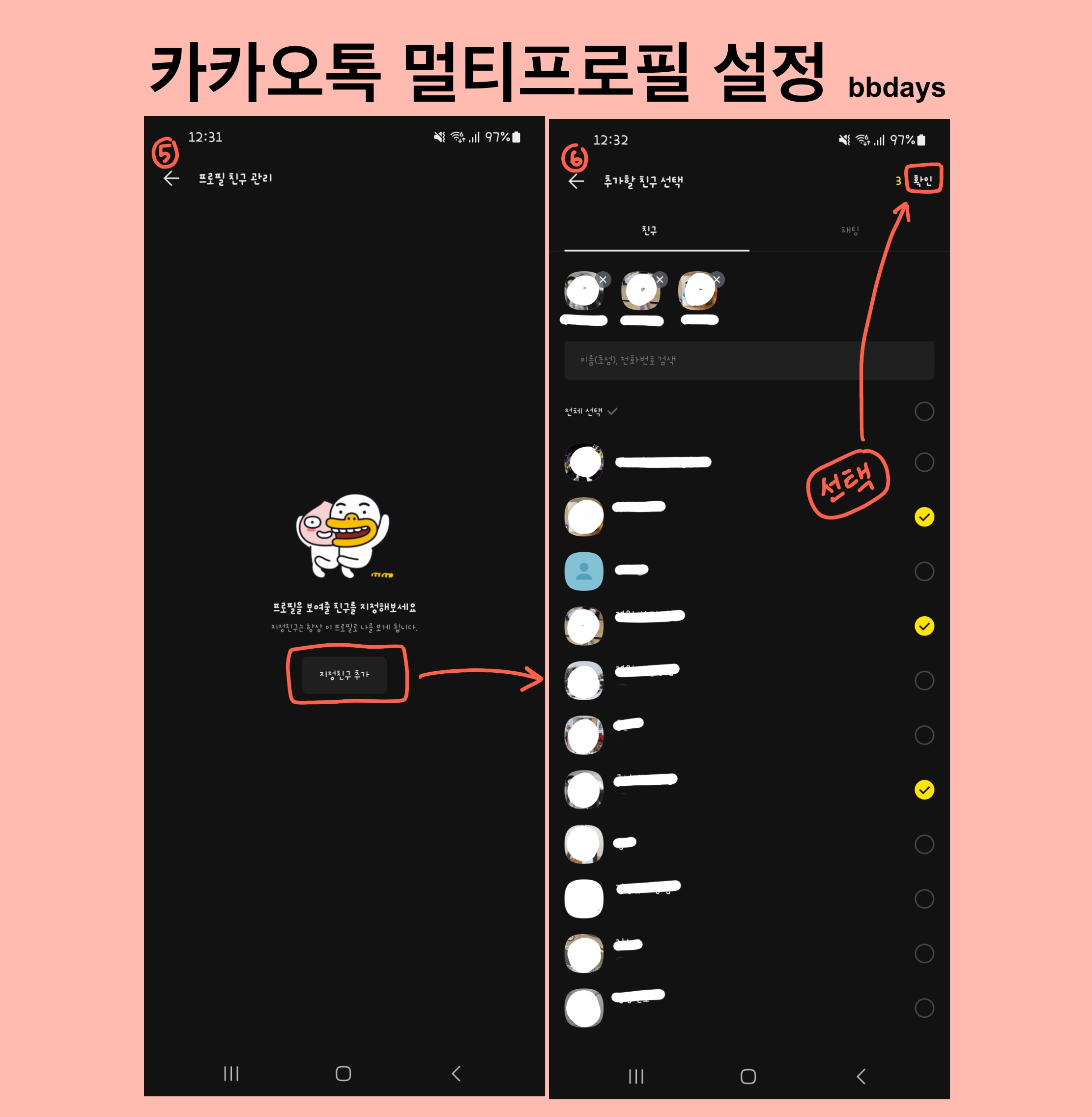 카카오톡 어플리케이션을 실행해줍니다. 실행하면 제일 처음 뜨는 메인화면. 친구가 보이는 목록에서 맨 위에 위치한 내 프로필의 이름 옆에 있는 오른쪽 화살표 ’>‘ 아이콘을 눌러 멀티프로필 화면으로 이동해주세요. 화면이 나타나면 맨 아래에 멀티프로필 만들기를 탭 해줍니다. 설정화면에서 사진과 스티커를 이용하여 프로필을 꾸며주세요. 나중에 설정하고 싶은 분들은 오른쪽 위에 완료버튼을 눌러 설정을 완료해주세요. 조금의 팁을 드리자면 이 프로필에 어떤 친구들을 보여줄것인지 생각하면서 꾸며주면 좋습니다. 프로필은 언제든지 변경할 수 있으므로 부담없이 설정해주세요. 설정을 완료하고 나면 멀티프로필 목록에 추가된 프로필이 보입니다. 여기에서 친구관리를 눌러주세요. 그리고 지정친구 추가를 클릭하여 새창이 뜨면 다시한번 지정친구 추가를 눌러 친구들을 추가해줍니다.